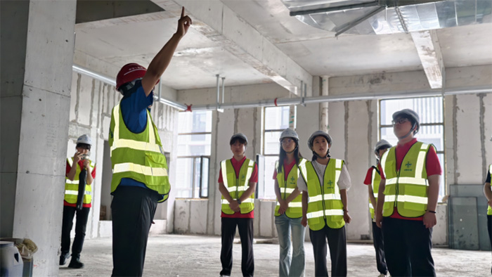 2、慧程科技園觀摩,實地研學獲豐實 由慧程科技園建設項目現場技術主管楊迎春帶隊,到慧程科技園建設項目觀摩調研,學習施工現場安全規范,發放安全防護裝備,明確實操環節的注意事項。重點講解了房建的創新工藝-樓板裝配式建筑工藝,針對樓板部分的預制裝配技術,簡單來說,就是先在工廠預制生產樓板構件,再運輸到施工現場進行吊裝、連接,最終形成整體樓板結構的施工方法,這種創新工藝的優勢明顯,能減少現場濕作業,縮短施工工期;工廠預制能保證樓板構件的尺寸精度和質量穩定性;還能減少施工現場的建筑垃圾和揚塵,更環保。讓學生明析房建工程創新工藝的突出優勢,進而理解科技賦能對建筑業轉型升級的推動作用,激發其對行業前沿技術的探索興趣與專業學習的針對性。
