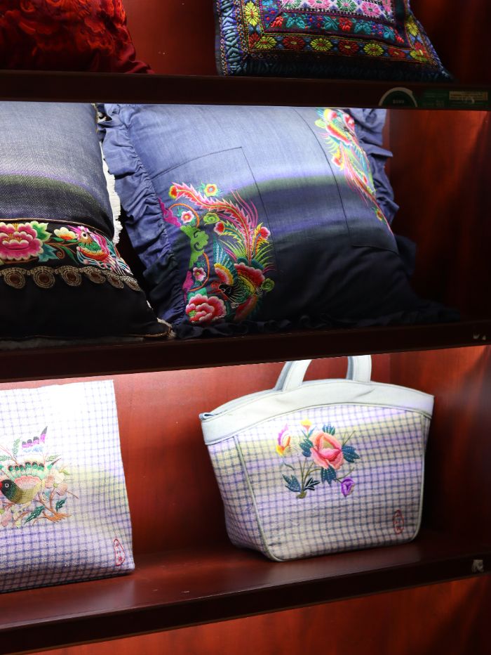 從“閨中技藝”到“致富產業” 苗繡是國家級非物質文化遺產,為發揚這一“特長”,2014年,十八洞村成立苗繡特產農民專業合作社,由非遺傳承人石順蓮擔任理事長。在她的精心指導下,95%以上的婦女都參加了苗繡專業培訓。在村頭的苗繡合作社展廳里,掛滿了融合傳統紋樣與現代審美的繡品:筆記本封面綴著簡約的蝴蝶紋,手提袋采用苗繡經典的“萬字紋”邊框,就連年輕人追捧的潮牌衛衣上,也點綴著抽象化的苗繡圖騰。合作社負責人龍獻文拿起一件標價899元的繡品外套介紹:“這是我們與長沙設計師合作的款式,上個月剛接到500件的訂單。”