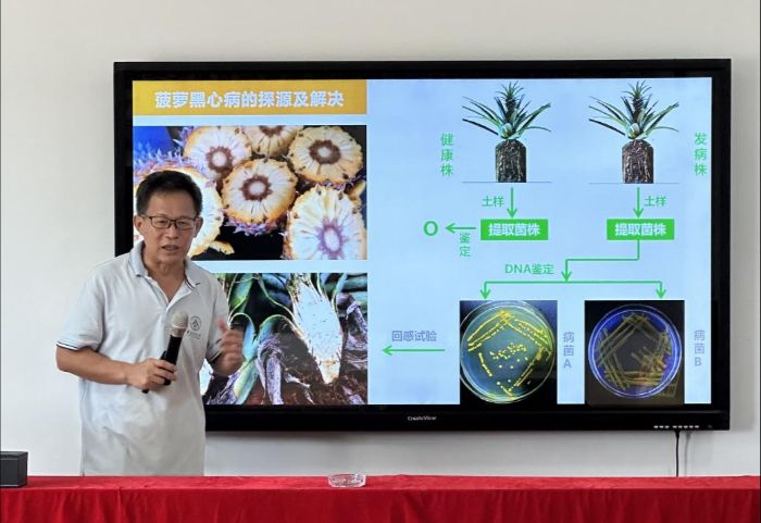 為讓助農內容“接地氣”、直播“有底氣”,尋跡實踐團系統開展了深度田野調研,重點走訪了華南農業大學駐徐聞工作站的示范基地牛哥驛站,與工作站主任姜峰院長就菠蘿種植模式優化、病蟲害綜合防治以及種苗培育技術等核心議題進行了專業研討。調研發現,當地通過推廣抗病優良種苗及智能水肥一體化系統的應用,已使黑心病發生率顯著降低;同時,產業鏈后端加工企業通過完善冷鏈物流體系、提升精深加工能力,正推動菠蘿產業從初級農產品向高附加值商品轉型,初步形成了"種植-加工-銷售"一體化的全產業鏈發展格局。