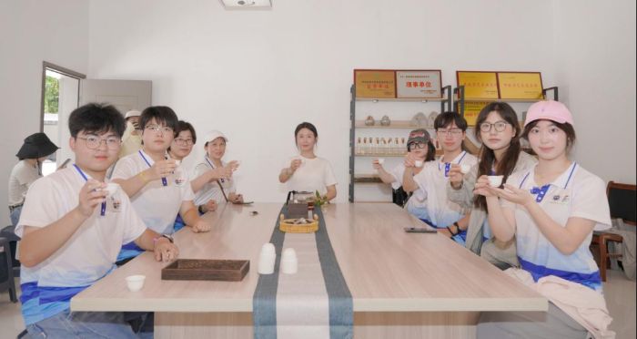 圖為基地負(fù)責(zé)人和實踐團(tuán)成員品嘗黃精茶 趙琪浩供圖