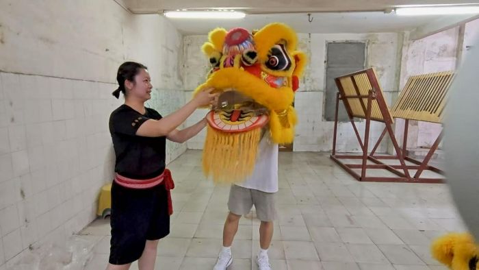 圖3: 醒獅教練丁舒姬師傅(左)向實踐隊員詳細講解獅頭構造的文化寓意。(歐舟 攝)