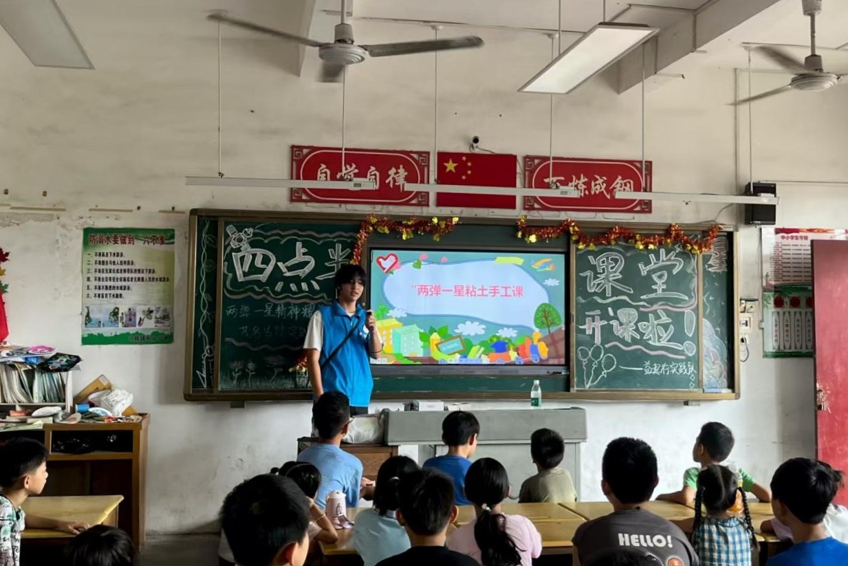 在7月5日~14日期間,益起行實踐隊立足鄉村振興戰略,充分發揮專業優勢,為馬踏鎮長山村學生量身打造了“七個一”特色課程體系。課程設計深度融合“兩彈一星”精神內涵,創新性地開發了“核你一起塑未來”主題泥土創意課、“兩彈一星”精神故事會等特色課程,通過“共讀一部史”紅色經典品讀、“共傳一技藝”非遺竹編體驗等多元化形式,將思政教育、文化傳承與創新實踐有機結合。實踐隊特別注重將“兩彈一星”精神融入“共拓一眼界”科普課程,在模型制作實踐中引導學生感悟“自主創新、開放融合”的科技報國情懷。同時開展“小手拍童謠”推普活動、“寶鈔通識”財貿特色課等,全方位助力鄉村教育質量提升。這種“精神引領+實踐育人”的創新模式,既豐富了鄉村課堂,也為探索教育賦能鄉村振興提供了新思路。