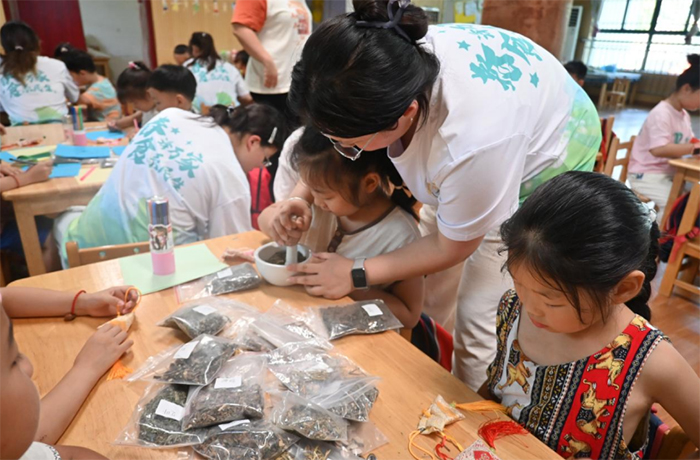 (圖為實踐隊員在郭河鎮幼兒園教小朋友做中藥香囊 “春芽食為天”志愿者服務隊/提供)