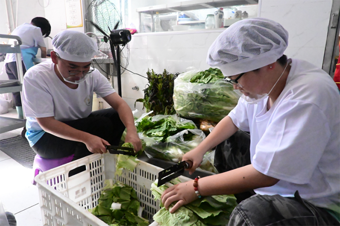 (圖為實踐隊員在老年食堂協助切菜 “春芽食為天”志愿者服務隊/提供)