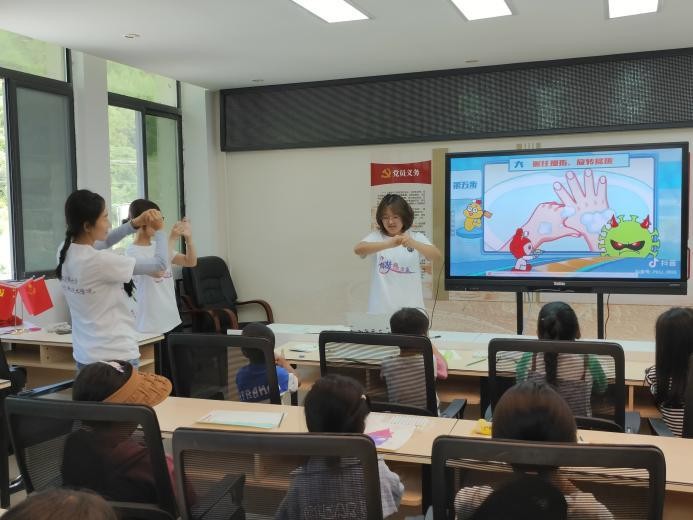 圖為實(shí)踐團(tuán)成員與孩子們共同學(xué)習(xí)“七步洗手法”