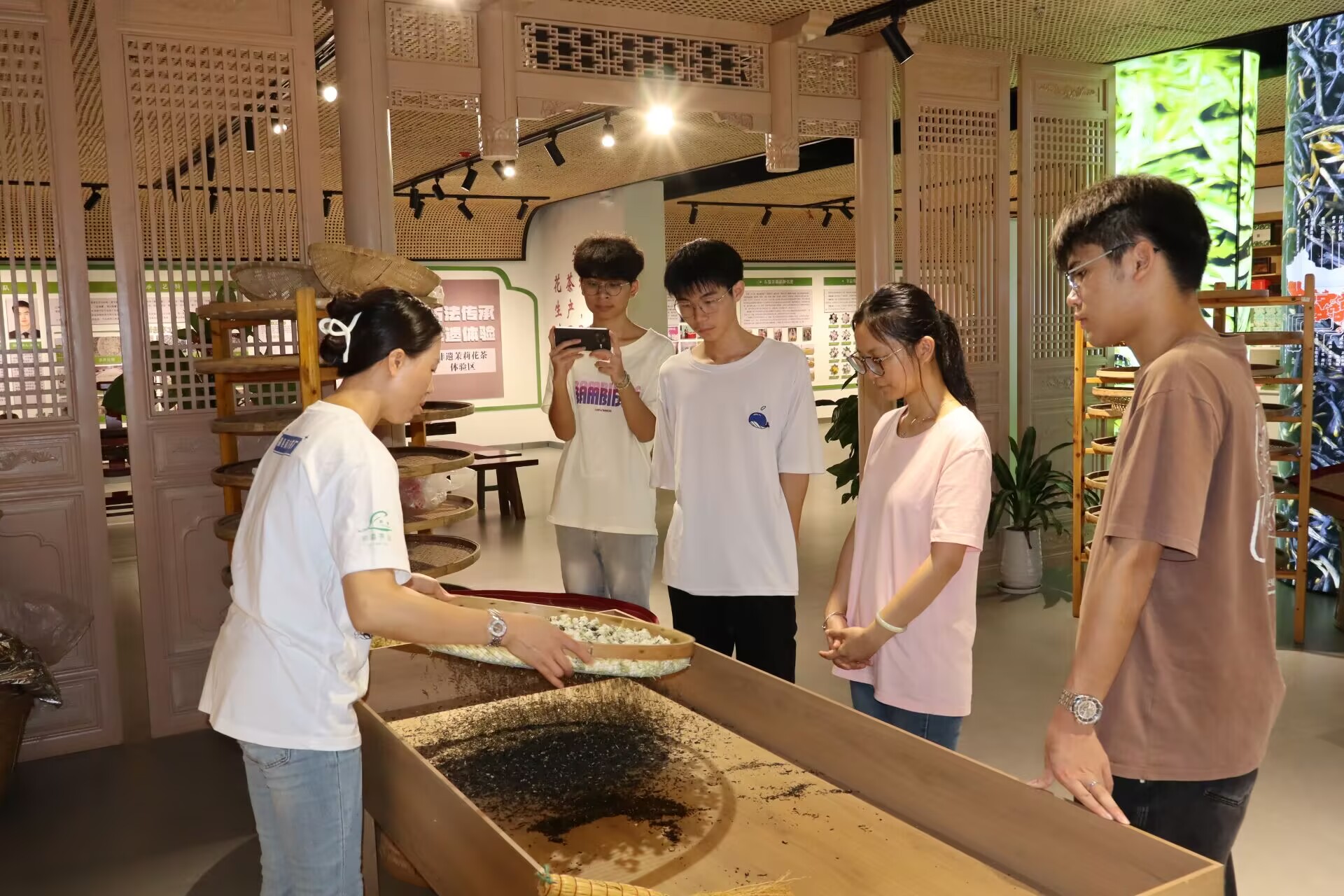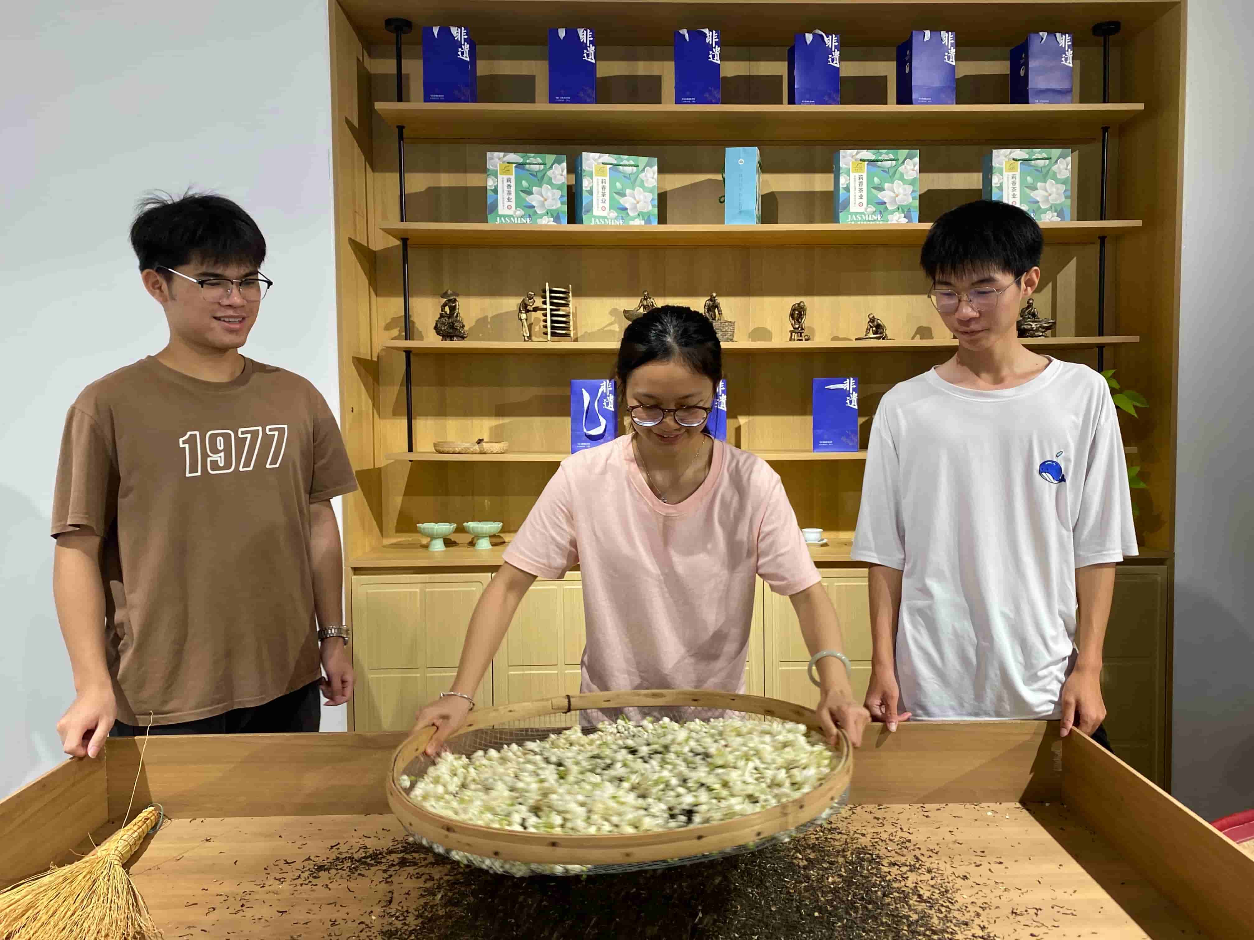 (圖為工作人員向?qū)嵺`團(tuán)成員傳授篩花、窨花等茉莉花茶加工傳統(tǒng)技藝 何欣語 攝) 紙上得來終覺淺。在仿古工坊內(nèi),實踐團(tuán)成員們親自體驗了篩花、窨花等技藝。他們小心翼翼地操作著古老的工具,感受著每一道工序背后所蘊含的匠心精神。通過親手實踐,成員們深刻體會到傳統(tǒng)技藝的精妙之處,也更加理解了非遺傳承的重要性。這不僅是一次技藝的學(xué)習(xí),更是一次文化的洗禮,讓青年學(xué)子們在實踐中傳承和弘揚了中華優(yōu)秀傳統(tǒng)文化。