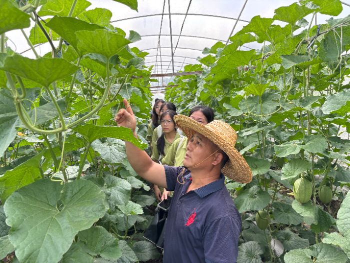實踐團首站抵達文合村瓜果基地。在哈密瓜園,村黨委書記韋同志介紹,當地通過瓜果合作社實現種苗選育、管護、銷售一體化,統一采用科學技術后,農戶風險降低,產量提升近三成。轉至香蕉園,工作人員詳細介紹掛果期溫控調節、防蟲網應用等管護技術,成員們聽后直觀感受到科技賦能下農業振興的鮮活態勢。