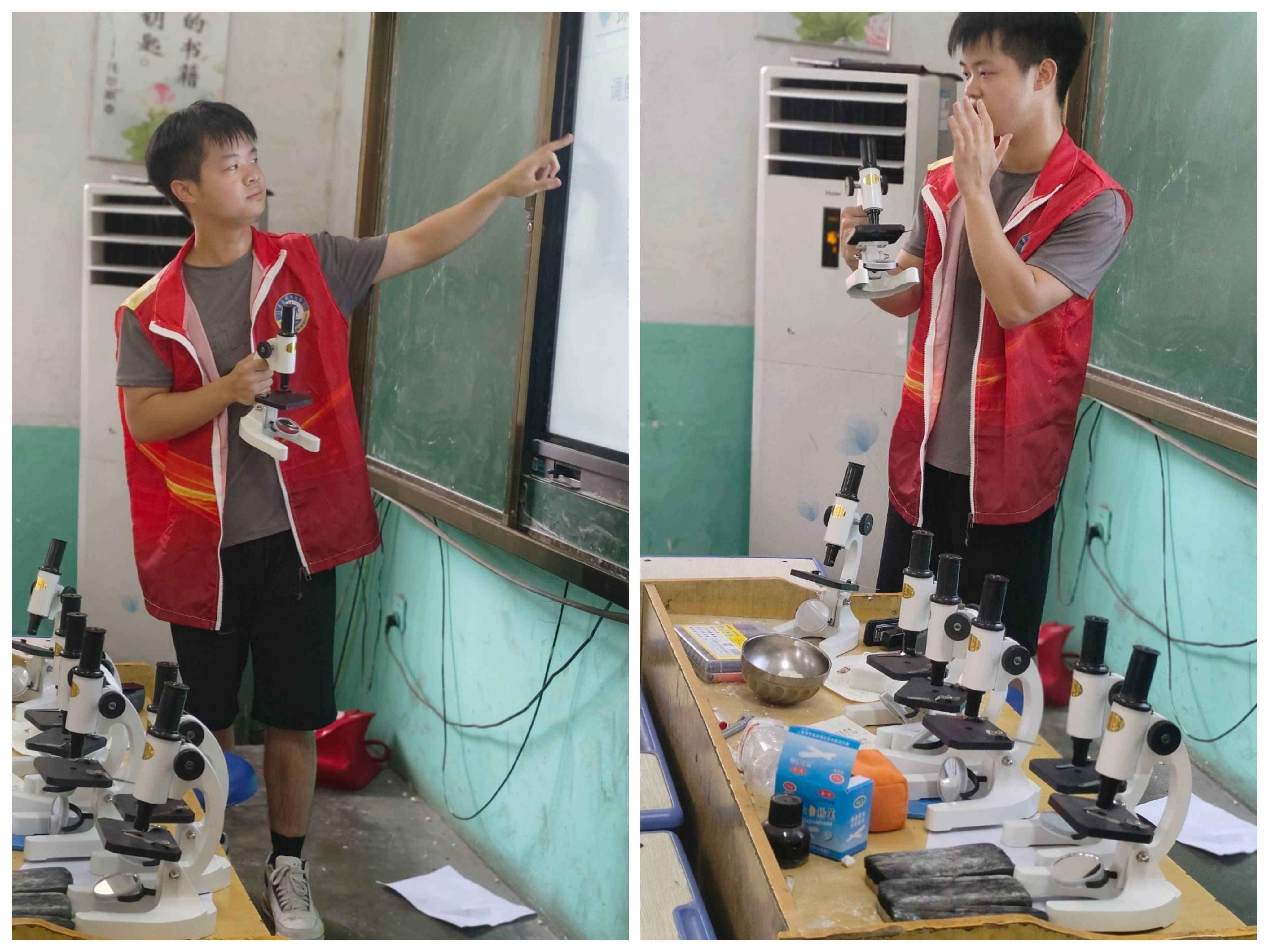 支教課堂上,團隊成員騰泰祁帶來了自己獨立制作的 PPT,從顯微鏡的操作原理、步驟到注意事項,層層遞進地講解基礎知識。他沒有照本宣科,而是舉起顯微鏡實物,邊演示邊提問:“大家猜猜這個‘小眼睛’能看到什么平時看不見的東西?” 生動的互動瞬間勾起同學們的好奇心,原本晦澀難懂的光學原理,在他的講解下變得清晰易懂。