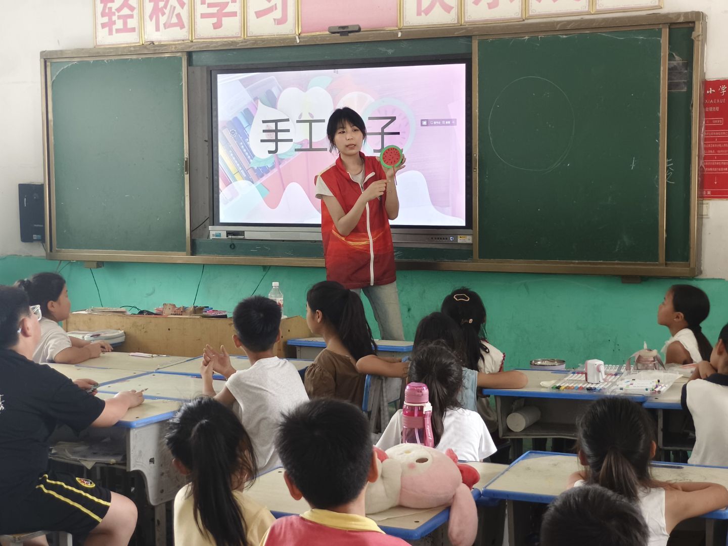 圖 志愿者為孩子們講解手工扇子制作步驟,黑板上展示著制作流程