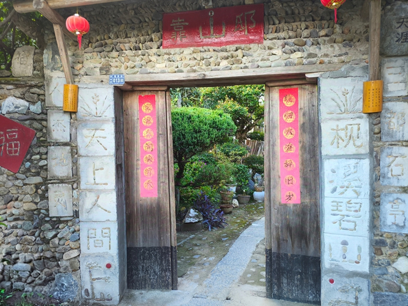 下午三點(diǎn),胡老師安排的觀光車載著隊(duì)員們駛向行程首站——“靠山邸”,門上用石頭在水泥墻面上拼出對(duì)聯(lián)“枧溪碧山,天上人間”。經(jīng)營(yíng)者江霞阿姨熱情地為大家沏茶,稍作休整后,眾人從“靠山邸”后門開(kāi)啟登山之旅。胡老師介紹,這座山由黨支部委員錢時(shí)安承包改造,15年間他種下600多棵樹(shù),憑一雙手默默打造出這片少有人知的“后花園”。江阿姨也笑著說(shuō):“這些年看著樹(shù)一棵棵長(zhǎng)大,路一步步修通,比啥都開(kāi)心。”