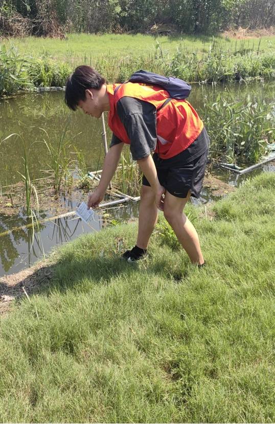 實踐中,成員們還有諸多實地探索場景。在郭猛鎮的河道邊,一位身著橙色志愿馬甲的實踐團成員,俯身專注查看水樣,認真記錄河道生態情況,為后續護河行動積累一手資料。