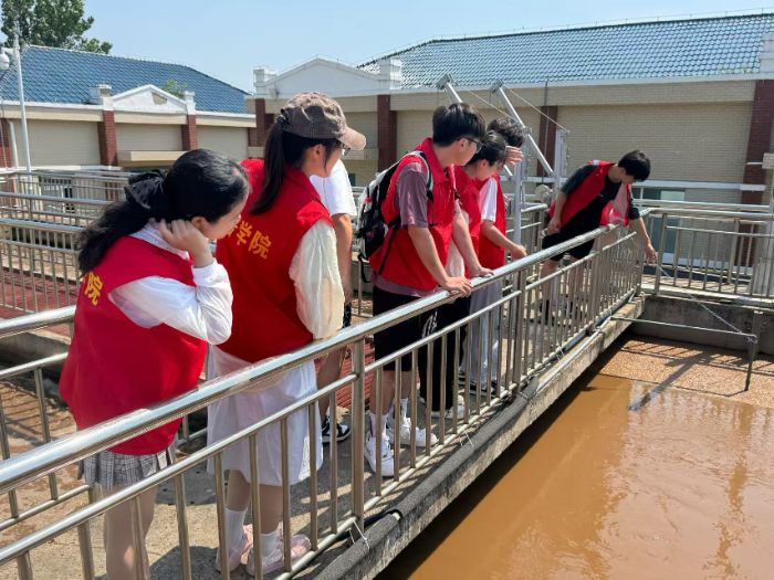 “原來一杯清水要經(jīng)過這么多道關(guān)卡!”看著提升泵房里渾濁的污水在管道中奔涌,纖維濾布濾池里逐漸清澈的水流,“三下鄉(xiāng)”實(shí)踐團(tuán)隊(duì)的“河小青”志愿者們發(fā)出由衷感嘆。2025年7月1日上午,鹽城工學(xué)院“河小青”團(tuán)隊(duì)8名志愿者走進(jìn)鹽都區(qū)郭猛鎮(zhèn)污水處理廠,深度探訪消毒池、提升泵房、纖維濾布濾池、流量槽、出水在線監(jiān)測房、二沉池等核心設(shè)施,在見證污水“涅槃重生”的過程中,更以親身體驗(yàn)解析蘇北農(nóng)村水源生態(tài)治理的現(xiàn)狀,用青春力量發(fā)出守護(hù)碧水的全民倡議。
