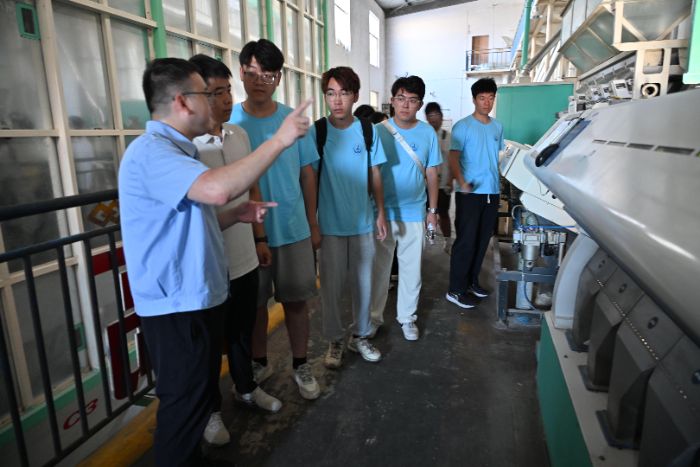 “大家看,這是初清篩和振動篩,負責去除水稻中的雜物。接著進入去石機,分離石子等重雜質。”張智偉指著高速運轉的設備介紹道。隊員們緊隨其后,親眼見證了水稻經過礱谷機脫殼、分離篩篩選、碾白、分篩、色選、拋光及包裝等全流程自動化作業。每一個環節都體現了科技的力量和精準的控制。