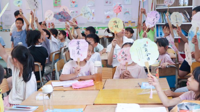 “扇面飄漆”環節進一步提升了活動的趣味性與參與度。孩子們輕壓扇面入水,觀察漆色花紋順著水流“爬”上扇面,形成各具特色的圖案:有的如晚霞漫染,呈現出“紫氣東來”的天然意境;有的似藍天白云,孩子們在其上增添“等風來”的字樣,寄托對清涼的期盼;還有的被繪上“滿帆起航”的圖案,傳遞出勇敢無畏的精神。每一把扇子都成為孩子們內心世界與千年技藝共鳴的見證,實現了童真與傳統的深度融合。