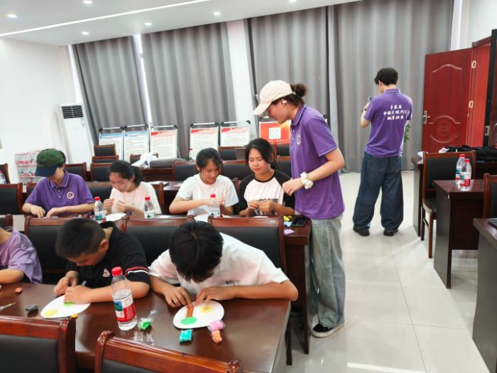 (圖為7月7日,“情系鹽城鄉(xiāng)村 愛撒支教課堂”團隊成員與孩子們圍繞粘土團扇制作交流。周蕓珂供圖)