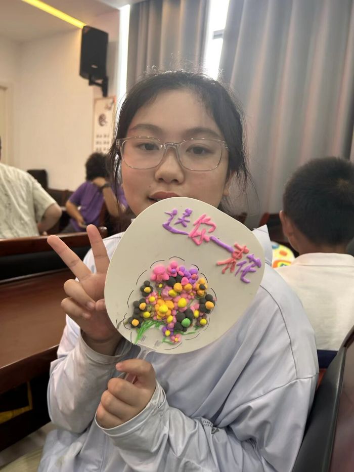 (圖為7月7日,孩子們手持粘土裝飾的創(chuàng)意團扇,開心比耶展示成果。楊珺涵供圖)