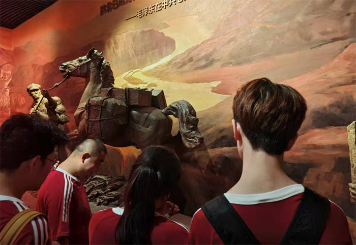 侯老師介紹:“抗大1936年創辦,十年培養大批軍政干部,辦學條件艱苦卻信念堅定。”成員們凝視展柜中的槍支彈藥、觀看視頻資料,仿佛回到烽火歲月。石板凳課堂讓大家聯想到如今的現代化設施,深刻體會先輩求學的不易。
