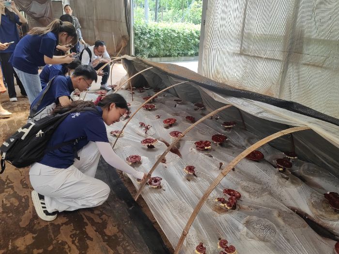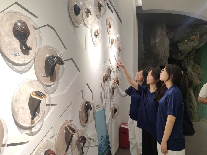 實踐首日,團隊踏入全國唯一的中華靈芝文化館,開啟跨越千年的 “仙草之旅”。館內五大展區以 “神農嘗百草” 傳說為引,300 余件古籍文獻、靈芝標本搭配現代影音技術,清晰鋪展靈芝從 “帝王貢品” 到 “百姓家珍” 的演變軌跡。生物科學專業的房同學指著展板注解,《本草綱目》中茯苓 “利小便,伐腎邪”、香菇 “益胃氣,托痘疹” 的記載,正是菌菇 “藥食同源” 的生動注腳。從秦漢貢品到明清家常菜,從藥用良方到日常食材,食用菌早已跳出單一形態,既是守護健康的 “天然藥庫”,更成了激活鄉村經濟的多元載體。現代科技展區里,孢子粉膠囊、靈芝黃酒等精深加工產品,讓傳統智慧與現代工藝的碰撞有了具象答案。