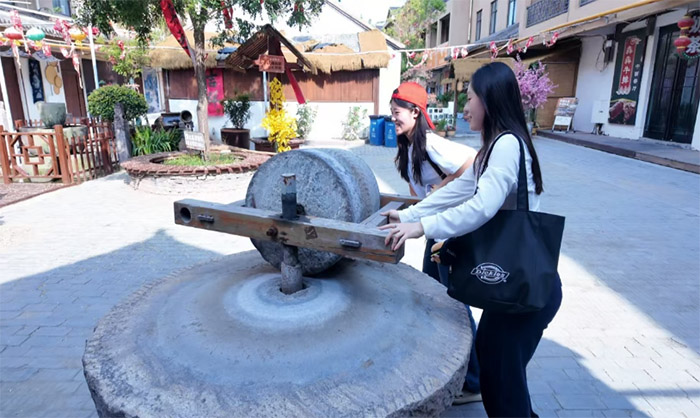 隊員趙梓亦、鄭倩梓在村民的辣椒合作社切身體會了如何磨辣椒,制作辣椒的過程。“這石磨盤超級重!”傳統制法雖操作不易,但村民們仍傳承著“原汁原味”的工藝。