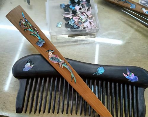 軟螺鈿:首先將貝殼切割成所需圖案,再貝殼打磨至0.1-0.2毫米的厚度。然后將打磨好的貝殼片根據設計圖案貼在紙上,一件精美的軟螺鈿工藝品就誕生了。
