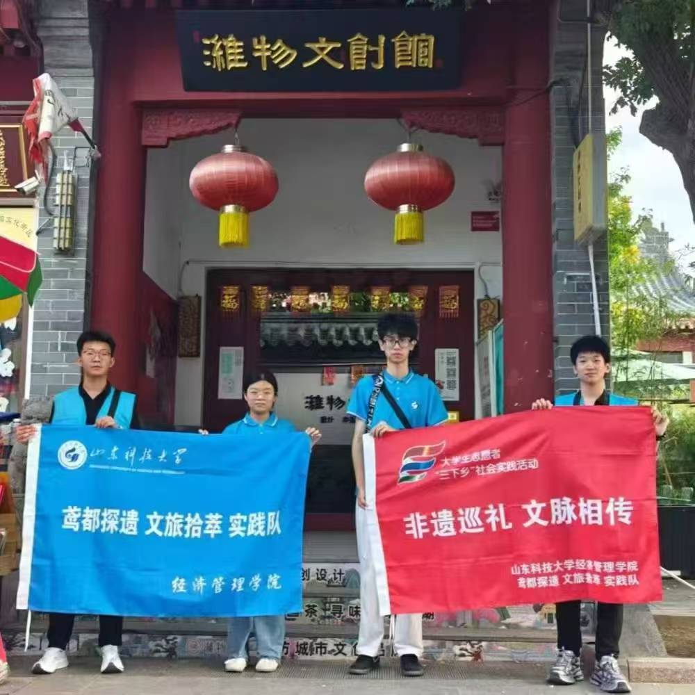 為深入貫徹文化傳承發(fā)展戰(zhàn)略,響應(yīng)國家非物質(zhì)文化遺產(chǎn)保護(hù)號(hào)召,幫助大學(xué)生深化對(duì)傳統(tǒng)文化的認(rèn)知、增強(qiáng)非遺保護(hù)責(zé)任感,7 月 26 日下午,山東科技大學(xué)經(jīng)濟(jì)管理學(xué)院 “鳶都探遺 文旅拾萃” 實(shí)踐隊(duì)于濰坊十笏園、濰坊市文創(chuàng)館及奎文門開展了濰縣磚雕主題社會(huì)實(shí)踐活動(dòng)。