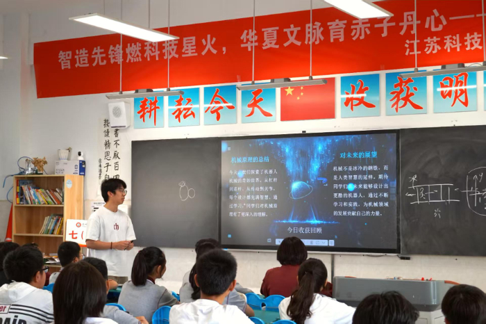 為深入貫徹“三下鄉”社會實踐精神,提升思想政治教育育人效果,江蘇科技大學張家港校區實踐團于2025年6月27日赴泰州市鳳凰初級中學開展暑期社會實踐活動。活動聚焦“愛國主義教育”“中華文化傳承”與“機器人專業知識科普”三大板塊,通過講解PPT、互動等形式,為初一學生播撒科學火種,厚植家國情懷。