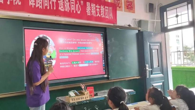 (圖為志愿者在借助花木蘭的故事教授英語)
