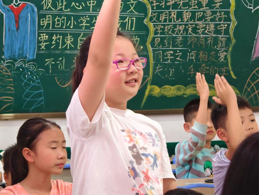 夏依林英文版《花木蘭》課程上,以動畫片段引入故事,再用簡單的英語短句引導孩子們思考。“Who is Mulan?”志愿者問道,扎著小辮的女孩立刻站起來,用不太流利的英語回答:“She is a hero!”隨后,孩子們分組扮演故事角色,在對話中自然掌握“hero”“brave”等詞匯,課堂上笑聲與朗讀聲交織。