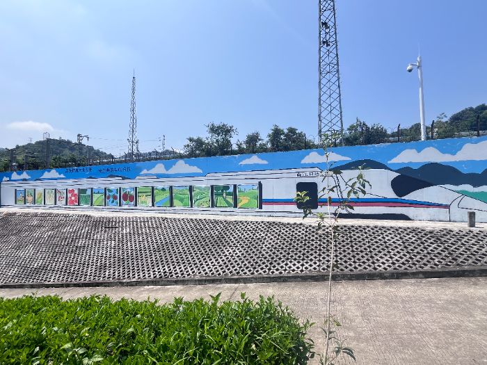 高鐵主題墻繪,是城鄉(xiāng)文明互嵌的隱喻。畫面中,飛馳的列車突破二維邊界,車窗內的郁南黃皮、南瑤大米等物產,既是地理標志的視覺轉譯,更是“縣域—村級”產業(yè)結構的符號呈現。