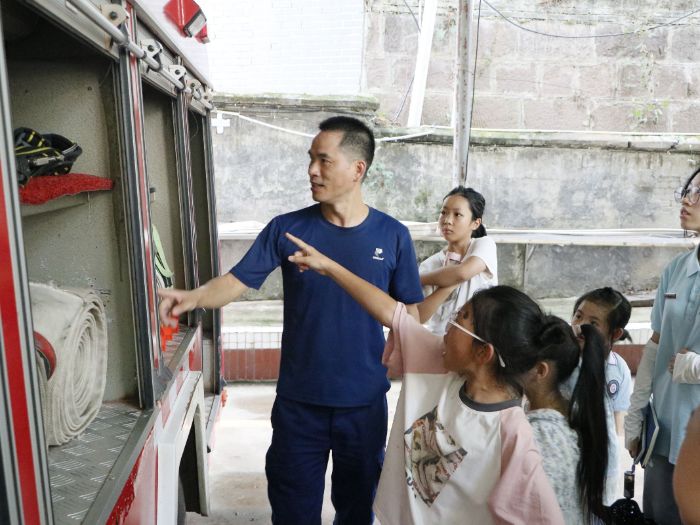 隨后,消防員不僅一一解答小朋友們的問題、還就介紹了隨車器材裝備,如水帶、高壓水槍、切割器等的性能參數、操作方法進行了專業且細致的講解,也現場演示了操作過程。隊員們和孩子們興趣濃厚,目不轉睛地盯著器材,認真聆聽講解。活動現場氣氛活躍,實踐團成員也耐心回應了孩子們提出的各種問題,互動環節充滿童趣與歡聲笑語。通過親耳聆聽和親眼目睹,孩子們也真切體會到了消防員日常工作的辛勞與日復一日刻苦訓練的堅持。