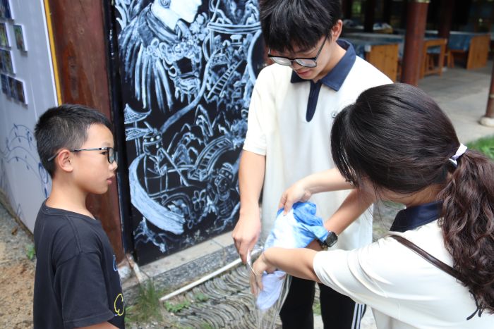 在中華布依八音堂,沉浸式非遺體驗深化文化認同:與研學孩童協作完成扎染,繪制藍白蝴蝶T恤;通過觀摩傳統農具體悟農耕智慧;體驗國家級非遺“布依八音坐唱”,在胡弦與刺鼓的悠揚鏗鏘中感受文化魅力。