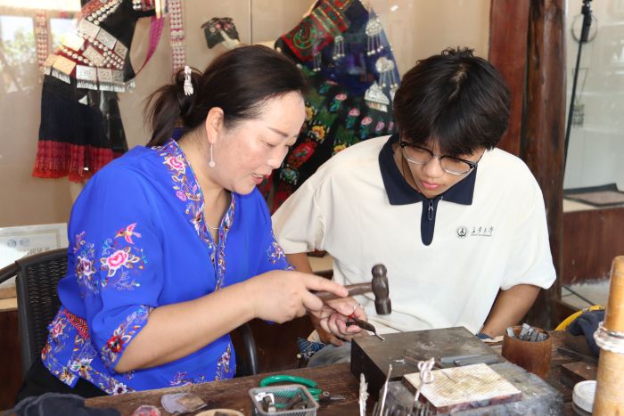 在張謹老師的指導下,隊員們嘗試了銀飾制作的鍛打、鏨刻和打磨等環節,通過親手實踐,隊員們對銀飾制作的復雜性和匠人專注投入的精神有了深刻認識。此次實踐不僅讓隊員們直觀了解了苗族銀飾的制作流程,更深刻體會到傳承這項國家級非物質文化遺產的重要意義。