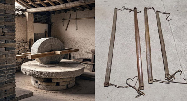 (圖1:石磨) (圖2:扁擔)