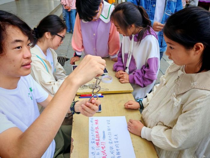 “九連環,漢諾塔,華容道,皆為智慧之瑰寶;小課堂,大天地,趣游戲,盡是思維之盛宴。”志愿者們拿出九連環、漢諾塔、華容道等經典道具,簡要介紹規則后,便讓小朋友們自主嘗試解開。九連環以其精巧結構和復雜解法著稱,從“一鏈解”到“九鏈通”,金屬環開合之間,盡顯古人智慧。志愿者現場演示拆解過程,引得同學們驚嘆連連。正如志愿者所說:“九連環不僅是玩具,更是古人邏輯思維的結晶,拆解過程考驗步驟規劃與耐心。”如今,不少中小學將其引入課后活動,借趣味拆解培養學生空間思維與專注力。