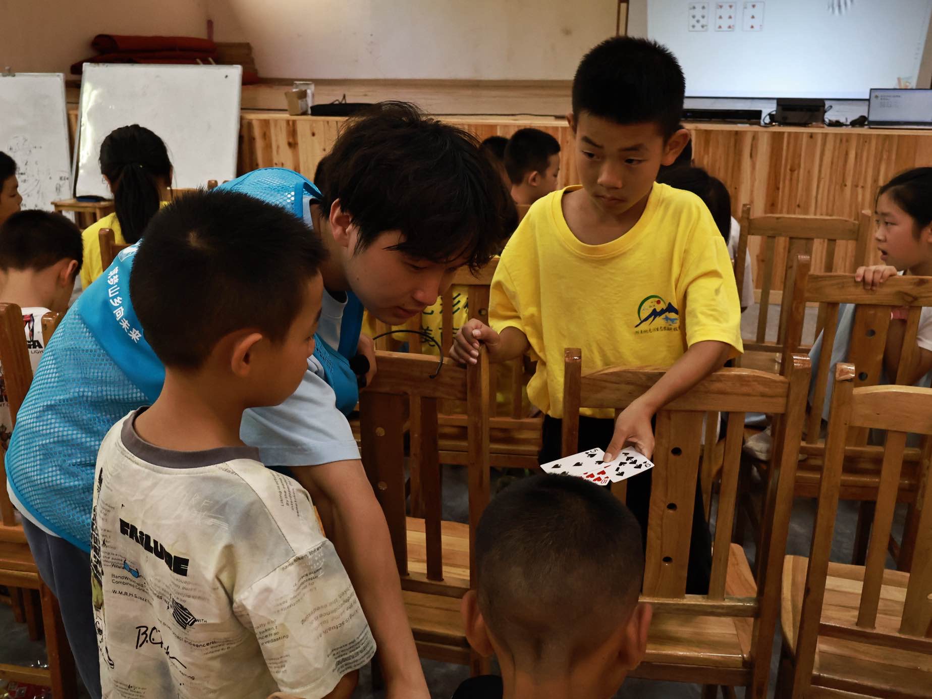 整十數“抓躲切”剛收兵,小學組25名同學又被火速召集到“24點擂臺”。支教老師謝錦輝把撲克牌往桌上一放,“戰斗”即刻打響。
