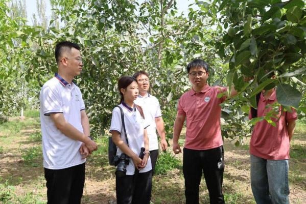 走進(jìn)阿拉爾愛疆農(nóng)業(yè)科技有限公司示范基地,一片綠意盎然,果樹長勢(shì)喜人。駐點(diǎn)研究生耐心地向團(tuán)隊(duì)成員介紹他們的駐點(diǎn)工作。