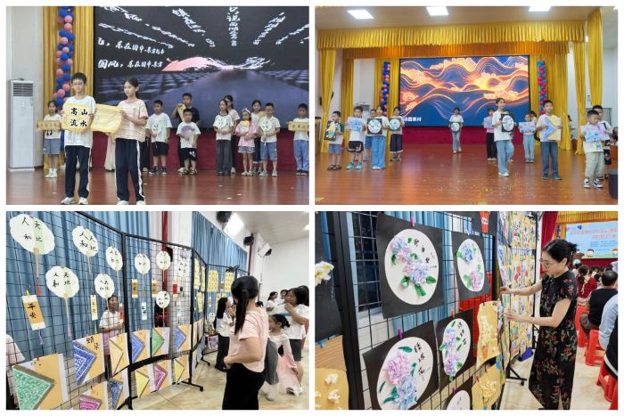 在"創意作品秀"環節,書法班和美術班的小學員們化身成為小小藝術家,自信滿滿地踏上舞臺進行藝術展示。書法班展示的作品有書寫"高山流水"四言作品、“平安”書簽“天地人和”四字書法團扇,筆力雖顯稚嫩卻已初具章法。美術班的繪畫作品有"海底世界"水彩畫、四季風景、融合瑤族元素的創意非遺蠟染等。非遺小課堂穿插其中,分別有剪紙、漆扇、植物拓印、扎染4種體驗課。