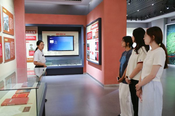 圖為團隊成員參觀紅色教育基地 李佳璐攝歷史長卷品讀——齊長城文化館的歲月沉淀 結束在紅色教育基地的實地探訪后,團隊來到了齊長城文化館。齊長城始建于春秋時期,楊家山里齊長城遺址作為其中一部分,距今已有2600年歷史,是重要的文化遺存。該館由齊長城文化價值概述、齊長城遺址保護與修復、長城腳下鐵山新姿等六部分組成,采用展板、視頻、互動多媒體等多種形式,全面宣傳了齊長城文化保護成果,有力地促進了文旅融合。在和講解員交流的過程中,隊員們也了解到當地已將齊長城遺址融入文化振興、產業發展的格局中,建設楊家山里文化體驗廊道,串聯打造起“游長城古跡、賞春秋風光、品齊魯文化”為主要內容的研學、休閑娛樂新目的地。