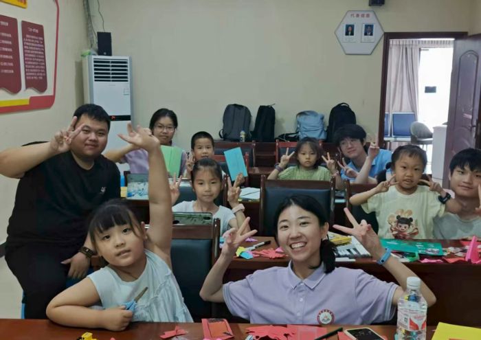 2025年7月10日至15日,重慶師范大學(xué)教育科學(xué)學(xué)院“藝語交融聽障教育關(guān)愛隊(duì)”在虎溪街道社區(qū)開展以“聽障青年筑夢行,多彩課堂暖童心”為主題的暑期三下鄉(xiāng)教育關(guān)愛實(shí)踐活動(dòng)。8名特殊教育(信息與資源)專業(yè)的聽障大學(xué)生參與其中,為社區(qū)小朋友帶來手語、繪畫、剪紙等別開生面的課堂體驗(yàn),促進(jìn)聽障群體與社區(qū)兒童的相互理解。