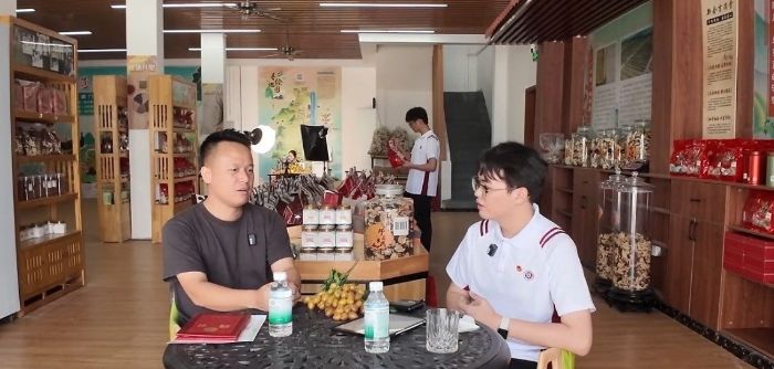專訪過程中,余進東重點解析了“陳皮文化+”的產業創新路徑,通過百千萬校地通平臺,聯合廣東東軟學院等院校對“崖門十二新俏”土特產品牌進行創意設計,實現農產品增值。當談及品牌設計時,有隊員具體詢問品牌包裝的突破點。余進東拿出幾款不同階段的陳皮包裝樣品,結合新會柑“皮厚、色深、香氣濃郁”的獨特品質,詳細講解了如何在包裝設計中融入“百年陳皮文化”元素,以及如何通過標注藥用價值認證信息提升產品公信力。期間,隊員們認真記錄要點,不時就包裝成本控制、市場接受度等問題與余進東深入探討。在新業態培育方面,組織電商技能培訓帶領本地人才開展短視頻推廣與直播帶貨。典型案例包括:橫水村鴕鳥肉烹飪直播單場觀看達5萬人次,帶動銷售額提升25%;京梅潘大姐系列視頻全網播放量超百萬次。這些實踐驗證了“文化賦能+電商驅動”模式對特色農產品價值躍升的促進作用。