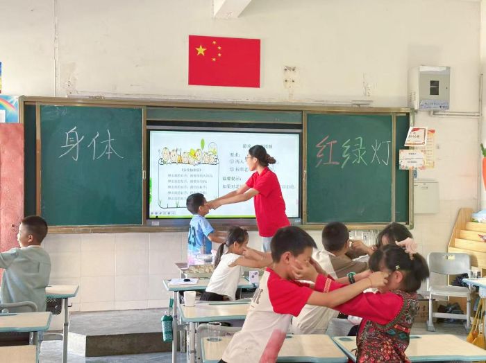 課程以《安全拍拍樂》游戲開場,“伸出我的右手,摸摸你的頭;伸出我的左手,摸摸你的肩……”學生們在實踐隊成員劉夢情指令下完成親密接觸游戲,過程中老師反復強調:“若任何接觸讓你不適,都可以立刻拒絕。”