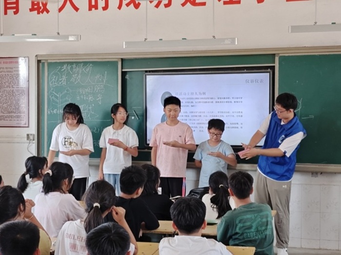 主持禮儀分享課上實踐團成員指導學生調整主持姿態 張轉娣攝