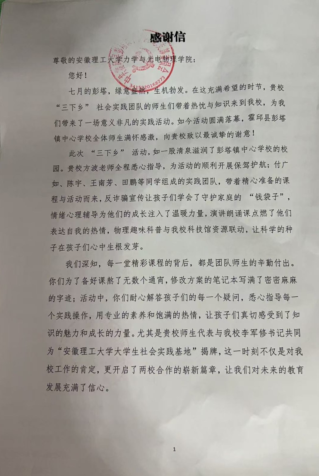 鄉村振興,教育當先。2025年7月20日至25日,安徽理工大學力學與光電物理學院“力行”鄉村振興實踐團走進安徽省六安市霍邱縣彭塔鎮中心學校,以暑期托管服務與實地調研為載體,將高校智力資源注入鄉村教育脈絡,踐行青年擔當。活動獲校方贈予“智播鄉校傳薪火,理光點亮少年心”錦旗,彰顯實踐育人實效。