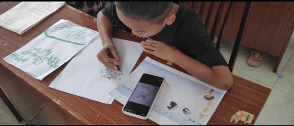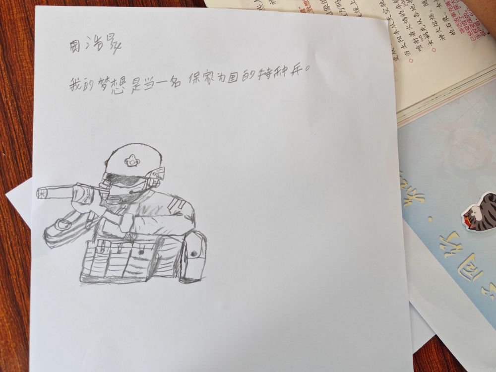 最讓大家難忘的是“我的未來職業”繪畫課。當看到周浩晨對著白紙發愁時,蘇倩彎下來腰輕聲問:“是不是想畫的東西太難了?”得知孩子想畫特種兵卻不知從何下筆,她立刻掏出手機搜索圖片,陪小輝一點點勾勒出穿迷彩服的身影。“他最后在畫的角落添了個五角星,說要像解放軍叔叔一樣保護家鄉,那一刻我突然懂了,我們教的不只是畫畫。”蘇倩在支教日記里寫道。(圖1:實踐團成員聆聽班必村村支書發言,拍攝者:浦仕玲;圖2:實踐團成員與小朋友們進行破冰游戲,拍攝者:金冬梅;圖3:實踐團成員指導周浩晨繪畫,拍攝者:陳翼航;圖4:實踐團成員拍攝周浩晨繪畫成品,拍攝者:陳翼航)