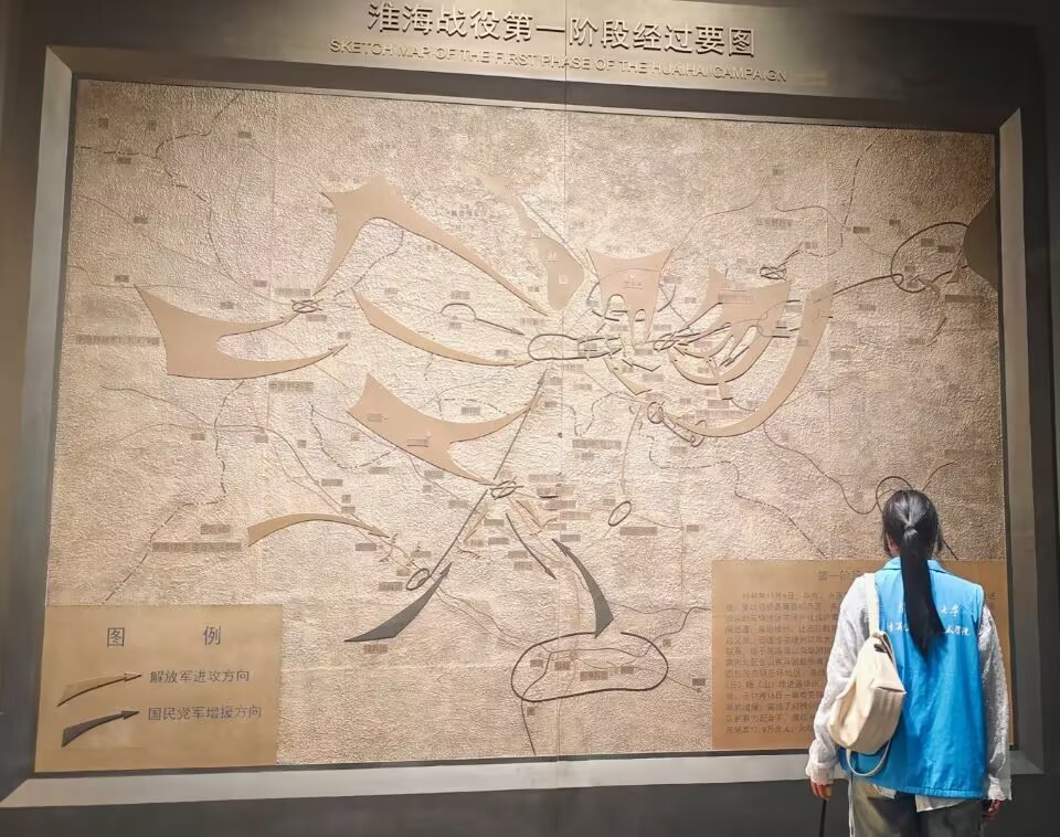 實(shí)踐團(tuán)一行來(lái)到了淮海戰(zhàn)役紀(jì)念館的序廳,這里通過(guò)大型三維場(chǎng)景復(fù)原和歷史資料展示,勾勒出了戰(zhàn)役的全貌。序廳內(nèi),燈光柔和而莊重,巨大的浮雕和壁畫生動(dòng)再現(xiàn)了戰(zhàn)役的激烈場(chǎng)景,讓人仿佛穿越時(shí)空,回到了那個(gè)戰(zhàn)火紛飛的年代。