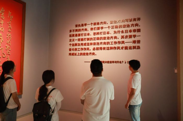 圖為實踐隊員在抗日軍政大學校歌畫布前駐足學習 梁雨攝