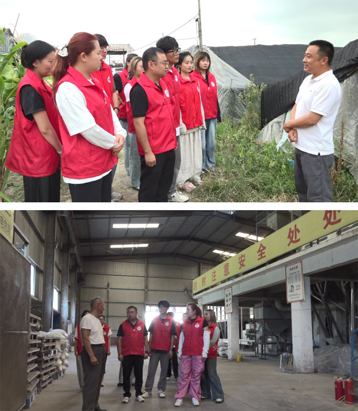產業探秘,見證“綠色經濟”蓬勃之態 在塌陷區治理區域,團隊實地參觀了光伏發電與農業種植的"農光互補"模式。水上光伏板下,魚蝦養殖池波光粼粼,實現"板上發電、板下增收"的雙重效益;蘑菇種植基地內,數字化溫控系統精準調節菌包生長環境,日產鮮菇超100公斤;葡萄、火龍果、藍莓等種植基地則通過"采摘經濟+電商直播"拓展銷路,帶動周邊300余戶農民就業。"我們與高校合作研發的深加工產品,讓藍莓附加值提升了3倍!"在藍莓種植基地,負責人向隊員們激動的說。實踐團還走進米面加工基地,了解傳統產業通過技術改造實現智能化升級的轉型故事。隊員們結合所學知識,為基地設計成本管控方案,獲企業高度認可。