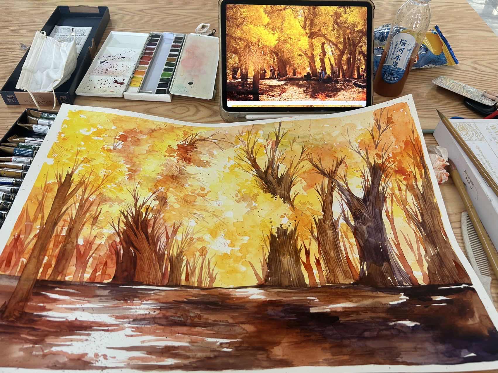 在景區(qū)實地工作中,團隊與景區(qū)管理方緊密協(xié)作,策劃推出“塔河源文化創(chuàng)意展”。學生們結(jié)合專業(yè)特長,設(shè)計出以胡楊、塔里木河為靈感的文創(chuàng)樣稿及繪畫作品20余件,通過景區(qū)展板集中展示。其中,手繪地圖、生態(tài)明信片等作品因兼具藝術(shù)性與實用性,引發(fā)游客駐足拍照,部分設(shè)計已被景區(qū)納入紀念品開發(fā)計劃。