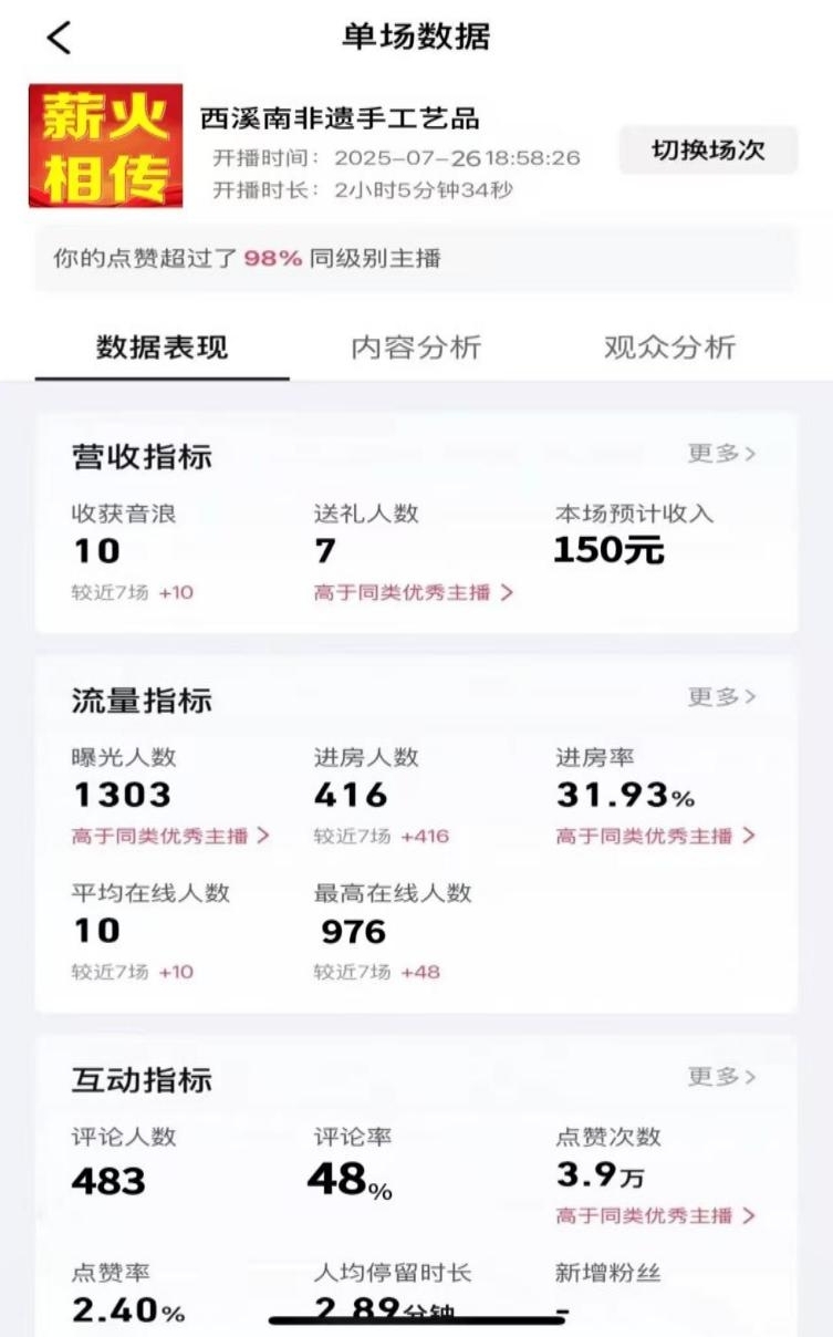 團隊首站走訪西溪南古村落,與徽州磚雕傳承人吳仕杰、木雕傳承人吳玉林等匠人交流,識別出線上流量不足、包裝同質化等問題。調研發現黃山毛峰、筍干等特產線上溢價空間達20%-30%,但包裝標準化率不足40%。針對這些問題,實踐團提出了將文化故事融入產品、通過短視頻進行場景化展示等創新方案。7月26日,團隊開展首場非遺手工藝品直播,2小時內吸引416名觀眾,獲3.9萬點贊,進房率31.93%,數據表現優于同類優秀主播。