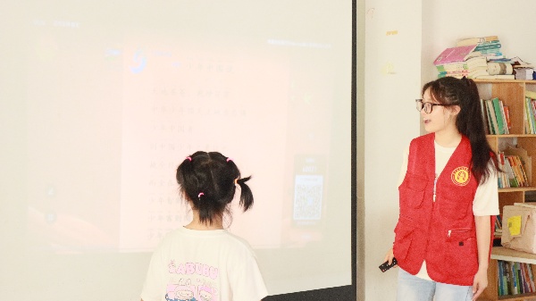 圖為云宣路戰(zhàn)隊隊員帶領(lǐng)孩子朗讀少年中國說 許展韓通訊員攝